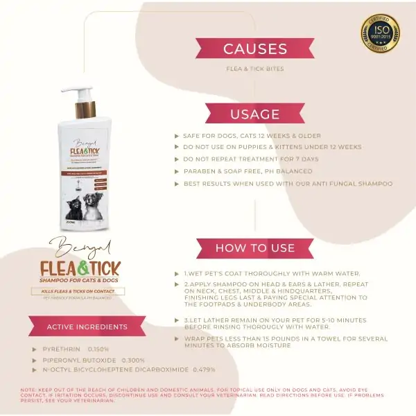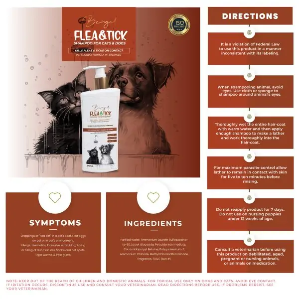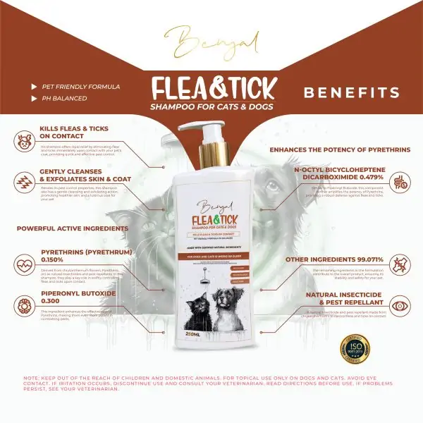 BENGAL FLEA & TICK SHAMPOO FOR CATS & DOGS KILLS FLEAS & TICKS ON CONTACT PET FRIENDLY FORMULA PH BALANCED